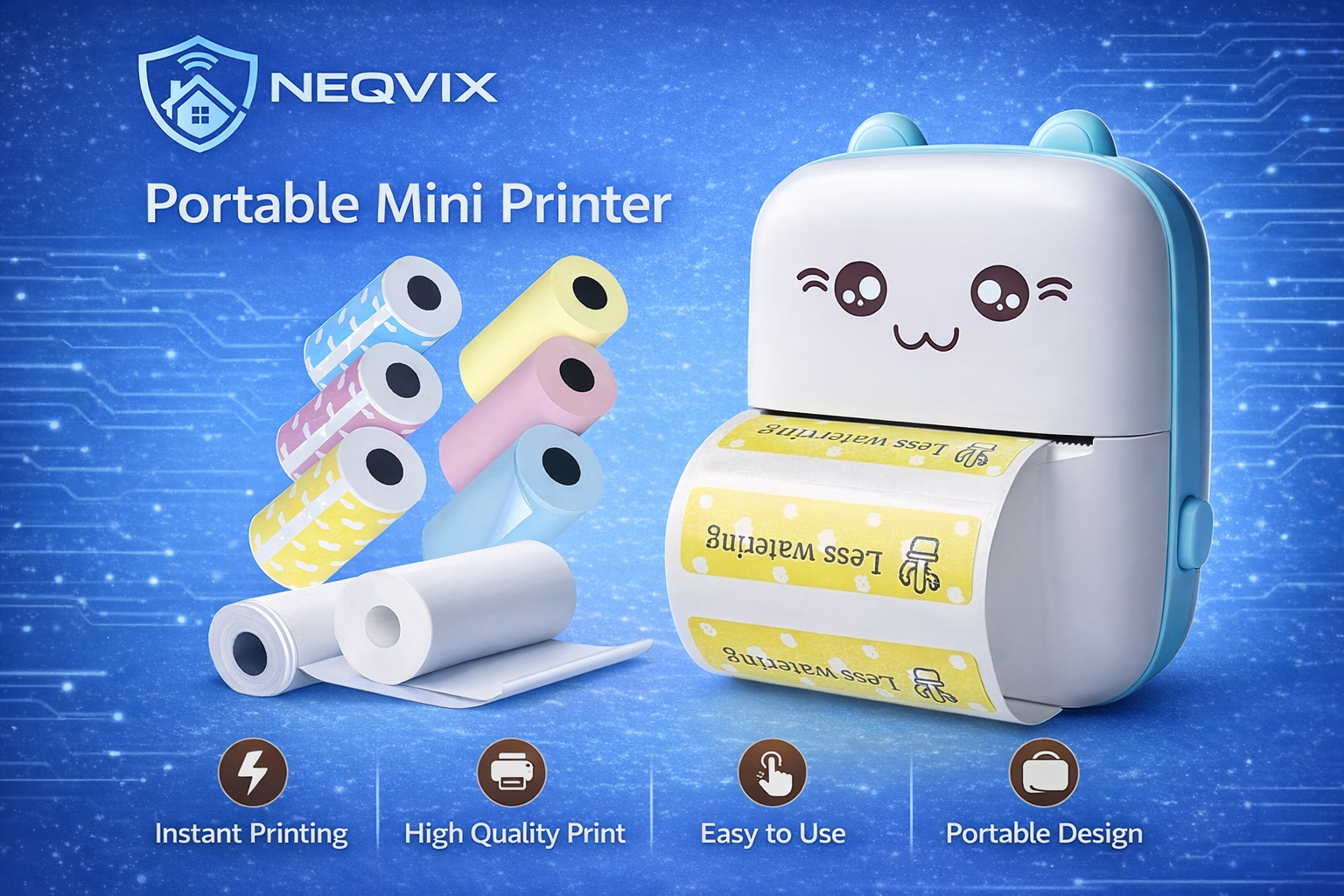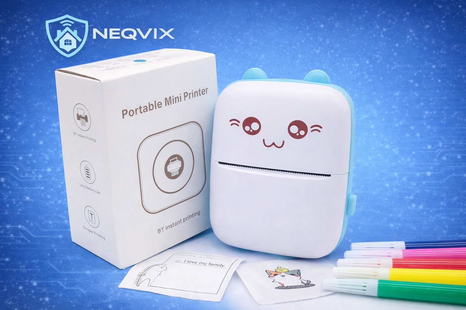 NEQVIX Mini Portable Bluetooth Printer is a compact wireless thermal printer designed for instant photo and label printing. It connects easily with your smartphone via Bluetooth and prints without ink using thermal technology. Perfect for notes, labels, photos, study materials, and creative DIY projects. Its lightweight and portable design makes it ideal for students, home use, and office tasks